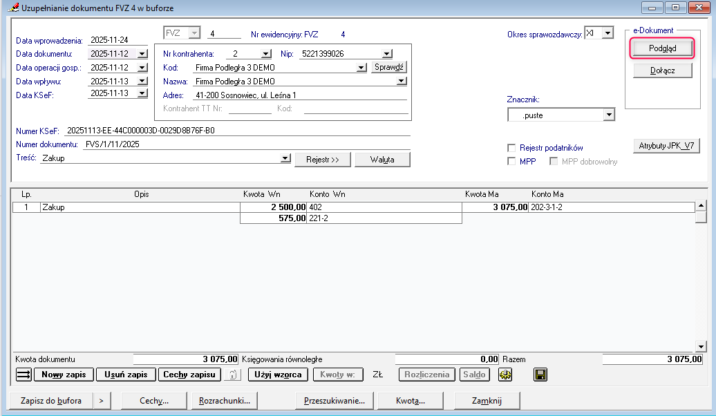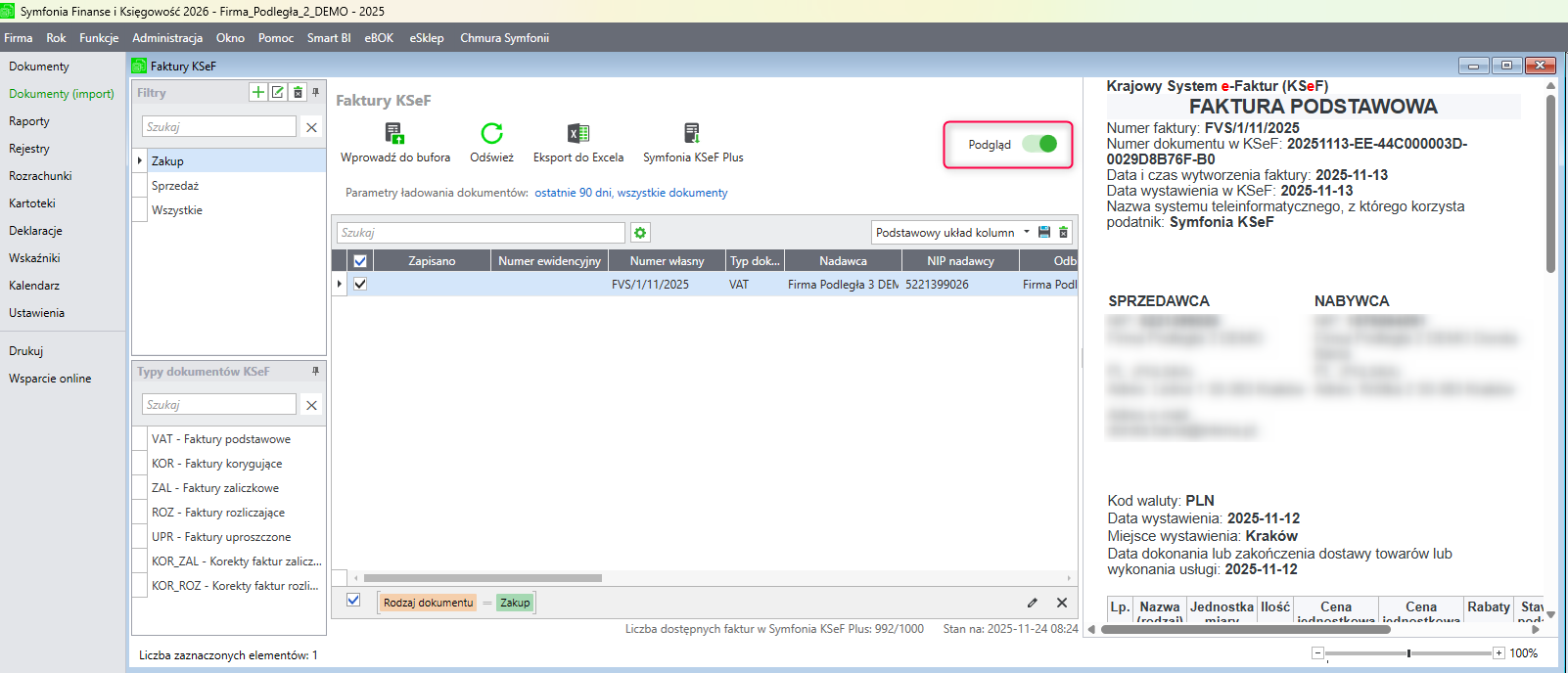 w nawiązaniu do zapytania uprzejmie informuję, że po pobraniu faktury z Symfonii KSeF Plus do programu Symfonia Finanse i Księgowość funkcja podglądu dokumentu będzie dostępna po kliknięciu w przycisk Podgląd, który znajduje się w oknie uzupełniania dokumentu w buforze: