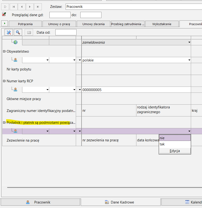 proszę ustawić u pracownika na zestawie Pracownik na dole w pozycji Podatnik i płatnik są podmiotami powiązanymi Tak lub Nie i wygenerować ponownie deklarację.