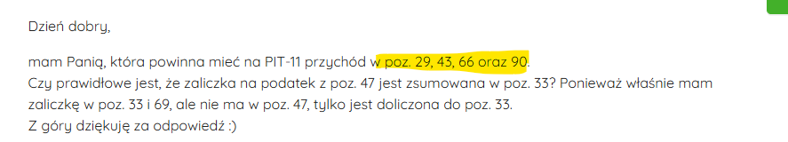 mam Panią, która powinna mieć na PIT-11 przychód w poz. 29, 43, 66 oraz 90.