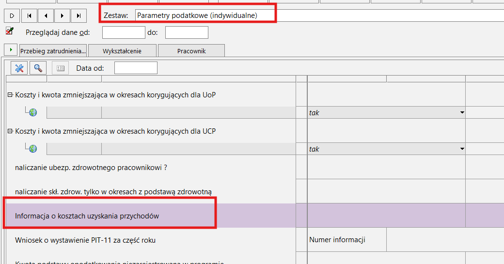 ta informacja jest pobierana z danych kadrowych pracownika z zestawu Parametry podatkowe (indywidualne) z elementu “Informacja o kosztach uzyskania przychodów” Jeżeli osoba miała tylko umowę zlecenia nie powinna mieć w tym elemencie żadnego wiersza. Jeżeli jest dodany wiersz należy go usunąć