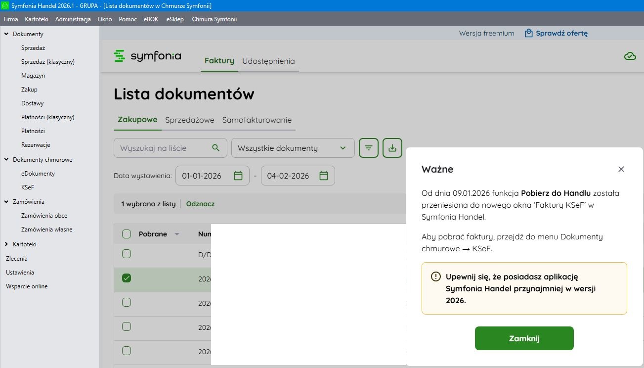 Posiadam Symfonie Handel 2026.1 i nie potrafię pobrać faktur z Ksef do programu.