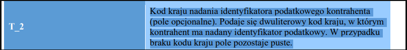 Jeśli przedrostek zostanie dopisany do NIPu w danych kontrahenta, to zostanie on zaprezentowany w polu T_2. Przedrostek w NIPie nie musi się zgadzać z krajem w adresie kontrahenta.