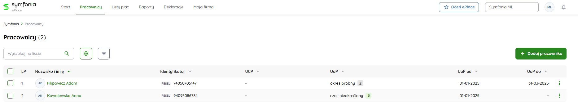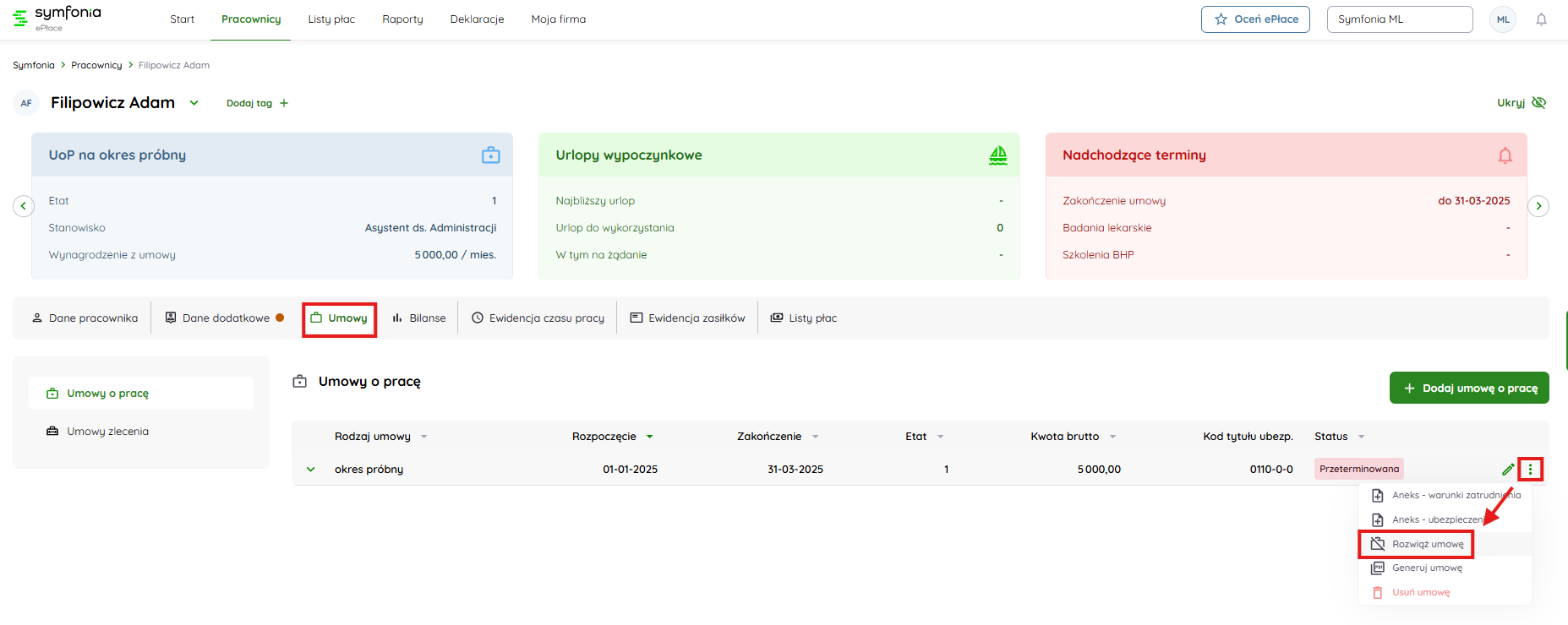 Na ten moment w programie ePłace dla każdego pracownika wykazana jest ostatnia umowa pracownika, jeżeli z pracownikiem została zakończona umowa i nie będzie przedłużona, to należy przejść do pracownika na zakładkę “umowy”, kliknąć trzykropki, a następnie “Rozwiąż umowę”. Po wykonaniu tej operacji umowa będzie miała status “Z - zakończona". Dopóki nie zakończymy umowy lub nie przedłużymy jej, to ostatnia umowa będzie miała status "P - Przeterminowana”.