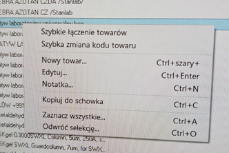Pod prawym klawiszem myszy otwierało się menu gdzie można było połączyć towary lub zmienić kod.