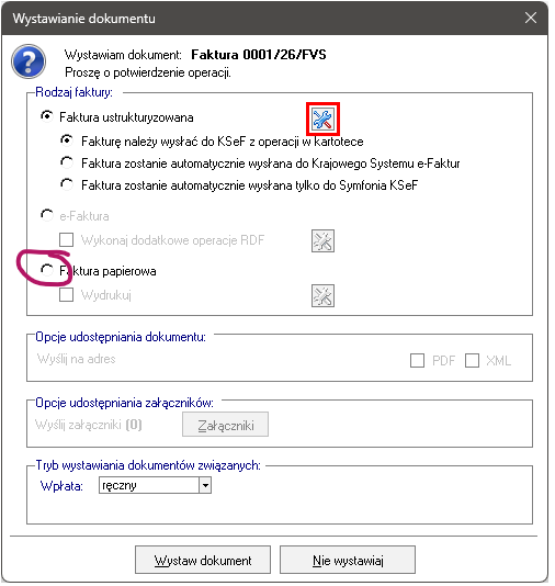 W przypadku ustawienia Faktura papierowa/eFaktura "pierwszeństwo" ma zawsze eFaktura. Jest to ustawienie predefiniwane, które nie podlega edycji.